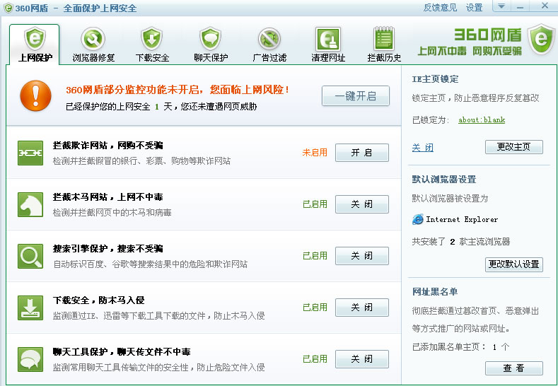 打开360网盾界面如图在钓鱼、欺诈网站拦截处点击 关闭